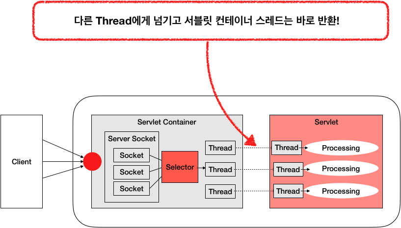- Request Thread는 Processing Thread에게 할 일을 위임하고 반환되어 재사용