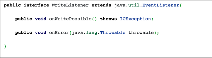 `WriteListener`는 Servlet container에 의해 호출되는 `onWritePossible()` 메소드를 가진 인터페이스이다. Output 스트림을 관리하는 `ServletOutputStream.isReady()` 메소드가 NIO channel buffer에 write할 수 있는지 여부를 체크하는데 사용된다. false를 리턴하는 경우, Servlet container에 대한 `onWritePossible()` 메소드를 호출할 것을 예약하고, 언젠가 다른 thread에 의해 `onWritePossible()`이 호출된다. 이런 방식을 사용하게 되면 `out.write()`는 느린 client가 channel buffer를 비울 때까지 block될 일이 없게 된다.